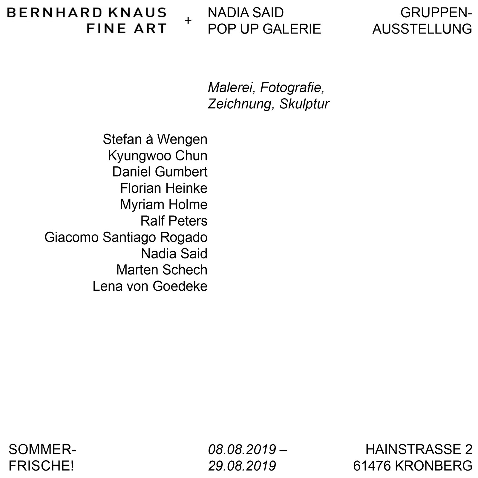 In der Zeit der vorigen Jahrhundertwende reiste das Frankfurter Großbürgertum zur Sommerfrische nach Kronberg in den Taunus. Ganz in diesem Geiste ist die Frankfurter Galerie Bernhard Knaus Fine Art vom 8. bis 29. August 2019 im Herzen Kronbergs in der Pop up Galerie von Nadia Said zur Sommerfrische zu Gast.