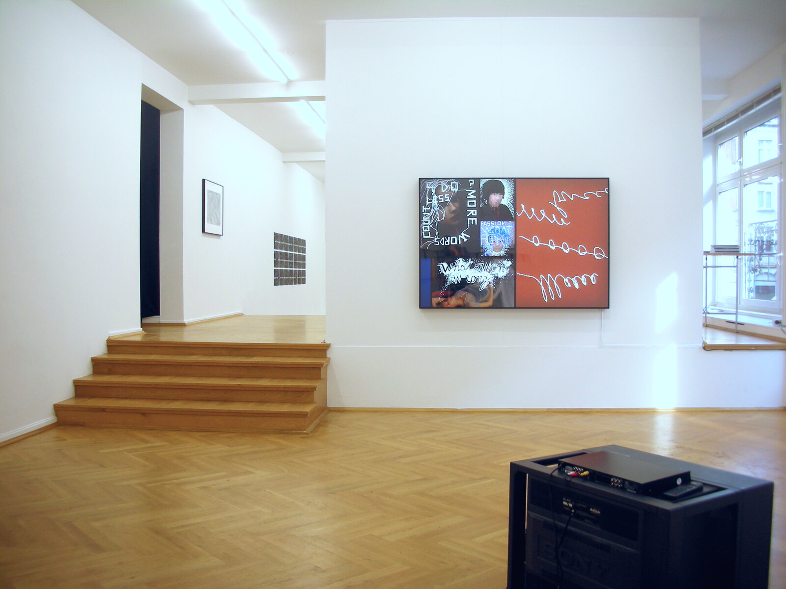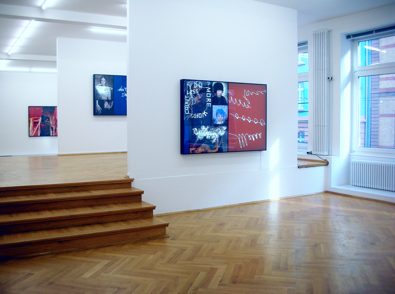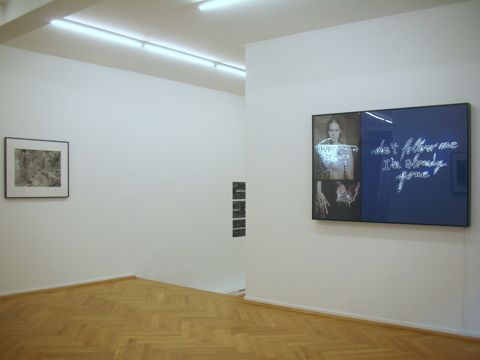 Verglichen mit den Statements sind die Videoarbeiten von Lawrence Weiner wenig bekannt. Er selber bezeichnet diese als structures, konstruierte Strukturen, innerhalb derer sich unverbundene, aber simultane Realitäten herausbilden können. Neben filmischen oder animierten Elementen können dabei oft Visualisierungen oder Rezitate seiner eigenen Arbeiten eine gleichwertige Stellung einnehmen. In seinem letzten Video WATER IN MILK EXISTS, 2008 setzt er bewusst künstlerische und pornografische Konventionen nebeneinander. Peter Schlör schafft mit seinen Schwarzweiss-Fotografien Realitäten, die so nicht fotografierbar sind und sich auch klar als hergestelltes Bild zeigen. Es sind Bilder, die eine persönliche Erfahrung wiedergeben, kompiliert aus der Bewegung im Raum, wie wir sie sonst nur in der Erinnerung, als Erfahrung aus der eigenen Bewegung oder Veränderung abzurufen vermögen. Nadja ist seit 30 Jahren Petra Wunderlichs Lieblingsbuch. Als Metapher der Plünderung lassen sich ihre Marmor-Steinbrüche lesen. Aber es sind auch offene Bilder, denn sie sind nur eine Momentaufnahme. Jederzeit kann ein weiterer Ausbruch von Steinblöcken eine anderes Bild entstehen lassen. Nur schwer lassen sich jeweils die Grössenverhältnisse erahnen, die jedoch gewaltig sind – als Rohstoff wertvollster Skulpturen. Offensichtlich als Kompilation angelegt sind die beiden gezeigten Arbeiten von Daniele Buetti – Werbe-Schönheiten, deren Perfektion sich durchaus auch als digital idealisiert und somit reiner Schein entpuppen könnte. Sie sind perfekte Projektionsflächen. Irritation erzeugt die bildliche (Zer-)Störung durch eingestochene Texte. Es sind jedoch tatsächlich Leerstellen, die uns das Licht aus dem Raum hinter den Bildern wie aus dem Off entgegenstrahlen lassen. Marcel Odenbach strukturiert Verstreutes durch Reproduktion zu Bildern, deren einzelne Teile uns aus den Massenmedien vertraut sind. Aus Verweisen wird ein Spielraum für den Betrachter und dessen Erinnerungen geformt. In seiner Arbeit "Im Kreise drehen" wird durch Ausschneiden dieser Verweis wieder relativiert, wenn durch die Leerstellen der Satz "Wenn man nur seine Vergangenheit so leicht ausspucken könnte" sich endlos wiederholt und buchstäblich Sprache zwischen den Bildern wird. Die veränderte Wahrnehmung durch die Vorinformation via Internet über Orte, die man zu besuchen beabsichtigt, ist Auslöser der Arbeit von Ayse Erkmen. Sie nutzte das Intro des Centre d'art contemporain d'Ivry - le Crédac anlässlich des Ausstellung "Variations continues" für ihre Videoarbeit Hearts and Circles. Es wird zu einer Leerformel der Aufmerksamkeit und somit zu einer für ihre Arbeit typischen Reflektion, die auf das Ermöglichen einer Auseinandersetzung des Betrachters mit der spezifischen Situation einer Ausstellung abzielt.