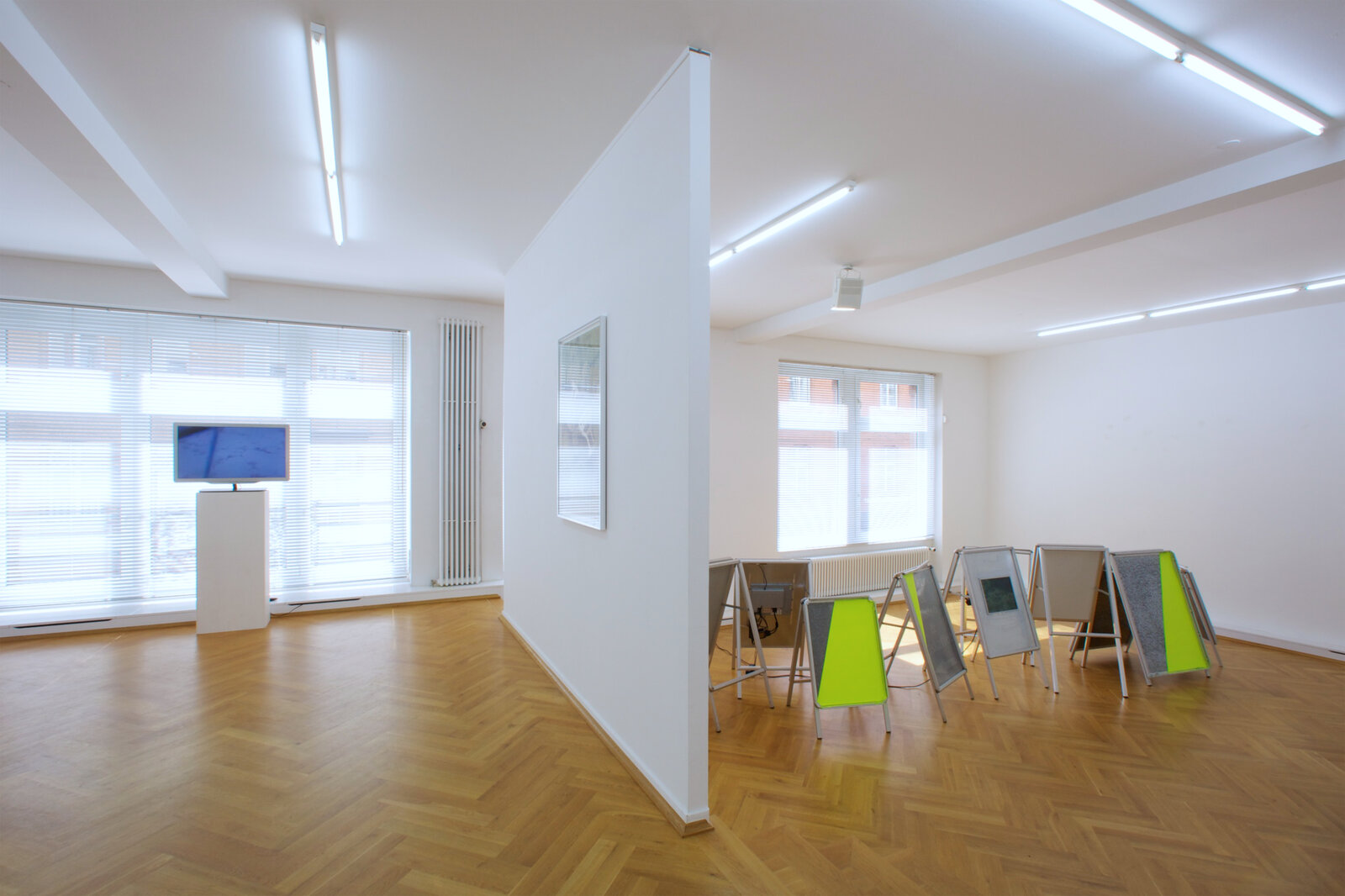 Gezeigt werden neue Collagen und Fotografien, sowie eine Serie von „Displaced Displays", die alle in Beziehung stehen zur zentralen Installation mit dem Titel „Surface Interference Study (after Courbet)". Diese Installation besteht aus einer Sammlung sogenannter „Kundenstopper", die zu einem abstrahierten Modell einer Brandungswelle zusammengefügt sind. Auf jeder Seite dieser raumteilenden Aufreihung ist jeweils ein Monitor eingelassen, auf dem eine Kamerafahrt über Details von Gustave Courbets Wogenbilder zu sehen ist. Diese zeigen die Brandungswellen wie aus Stein gehauen, während der Untergrund wie verflüssigt wirkt. Diese Dialektik zwischen Auflösung und Materialisierung, die das Meer als tatsächlichen Ort wie auch als Metapher prägt, zieht sich durch alle weiteren in der Ausstellung versammelten Arbeiten.