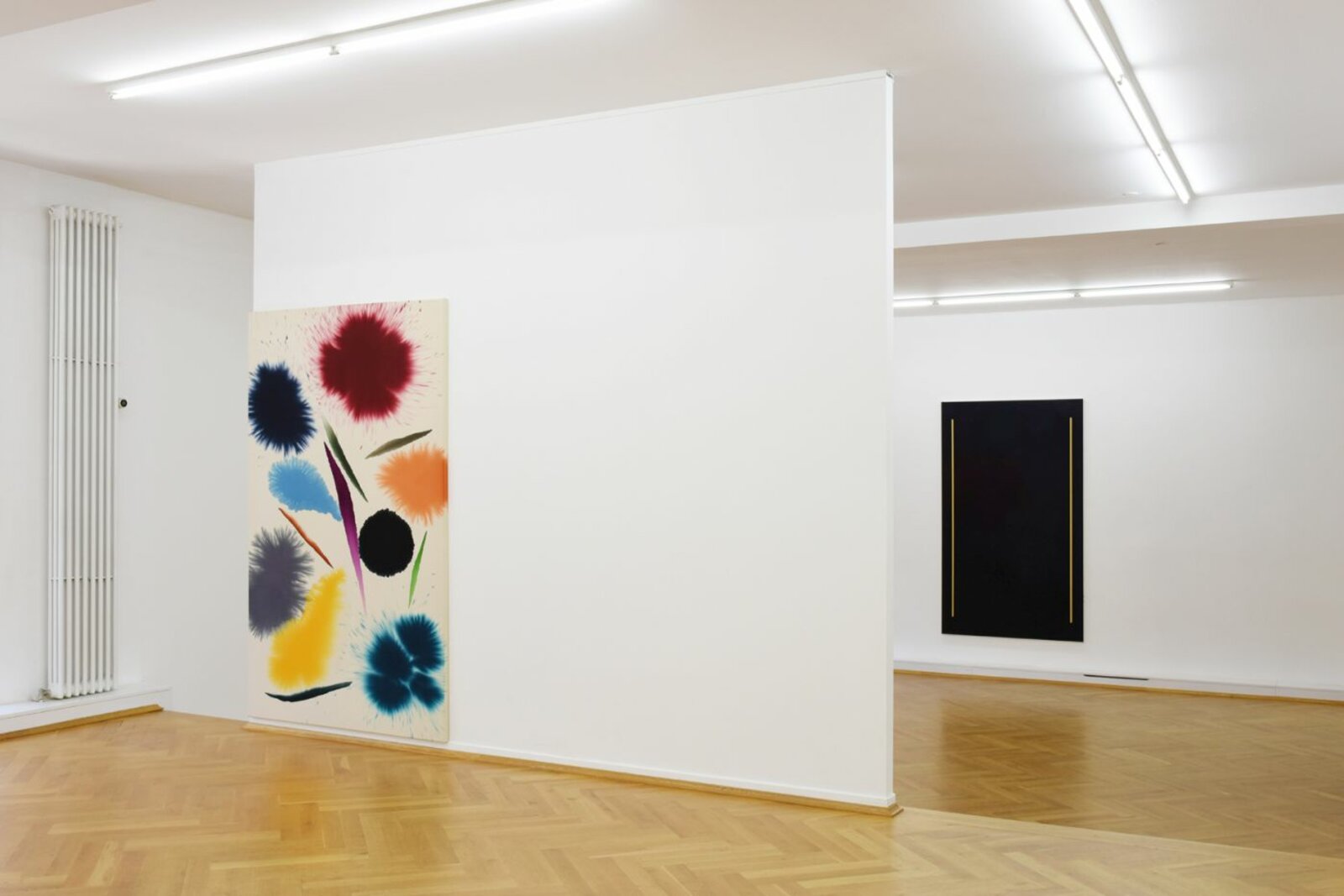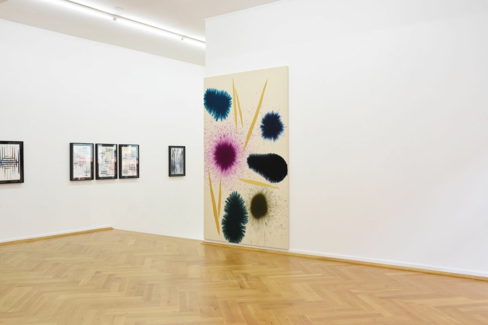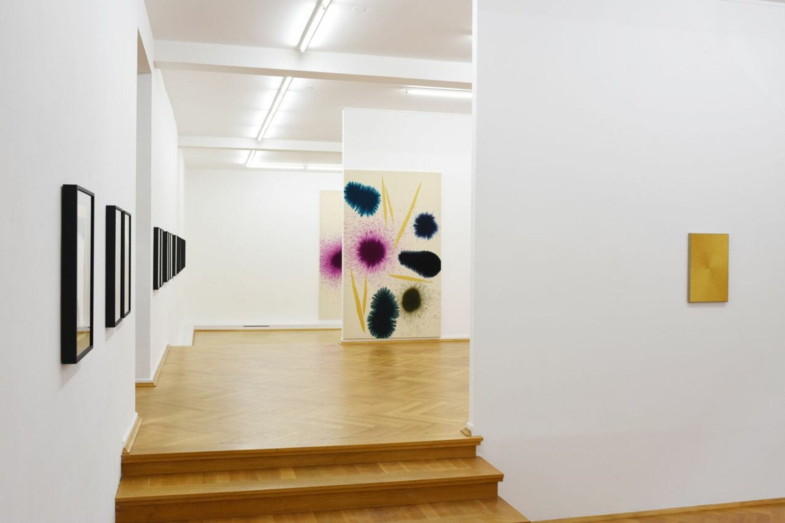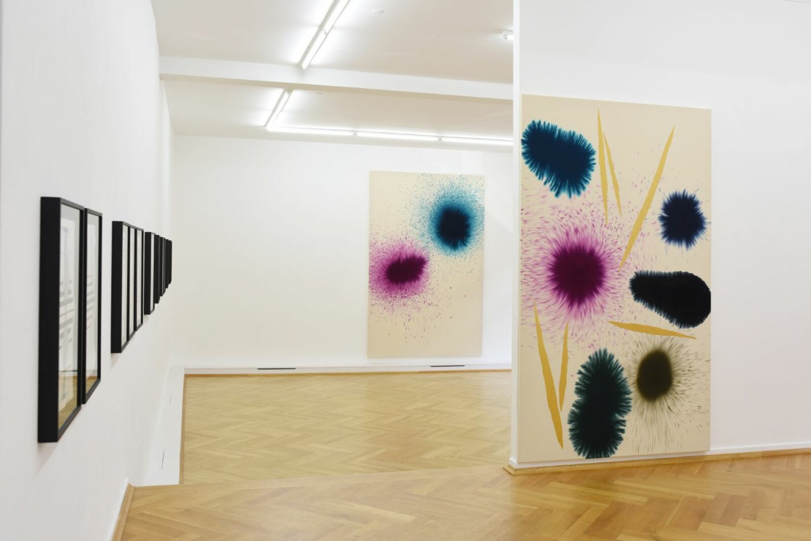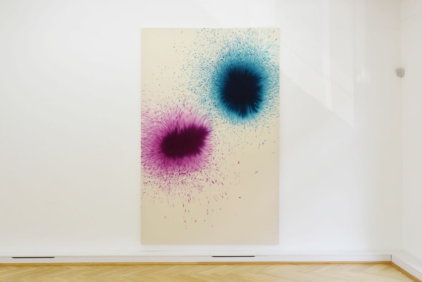 Formen, die durch die Perfektion ihrer Verläufe oder weich fliessende Farbgebilde auffallen - mal mit verwischt unscharfen, mal hart abgegrenzten Kanten -, kennzeichnen viele der Bilder von Giacomo Santiago Rogado. Es sind bewegt wirkende Farbflächen als eingefrorener Zustand eines "Entwicklungsprozesses". Rogado schafft die Umstände, unter denen solche Verläufe entstehen, in einem Wasserbecken, in das er die Leinwand legt und nach alter klassischer Färbetechnik Salz und Färbemittel einstreut. Rogados Bilder sind weder reiner Zufall noch reine Komposition. Sie entstehen in einem langsamen autopoietischen Prozess, bei dem der Künstler nur den Ausgangspunkt festsetzt. Es sind Spuren eines praktischen Umgangs mit Farbmaterial. Und sie provozieren durch ihre Unbedarftheit.