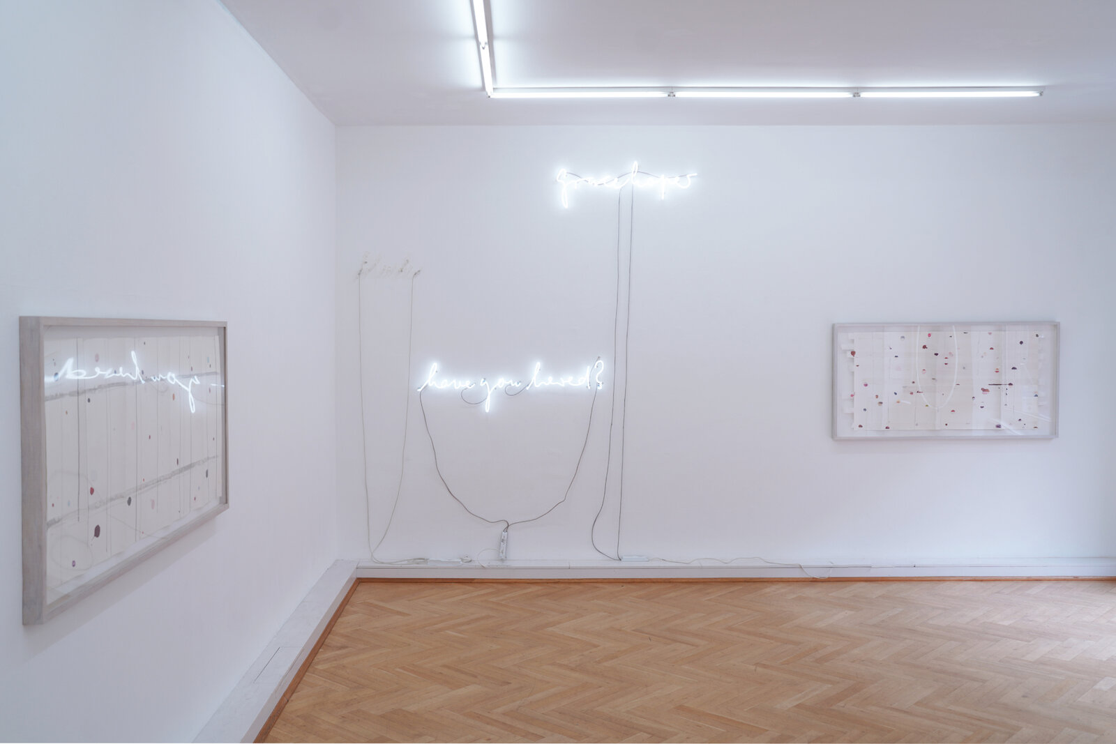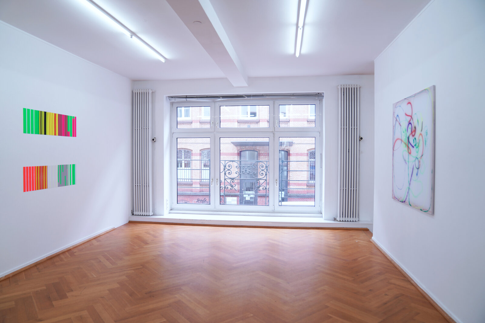 Herbert Hinteregger insert "cerebrum eins“ von Myriam Holme. Transformation, Reduktion, Kontemplation und Konzentration sind Ebenen des prozessualen und konzeptuellen Malansatzes von Herbert Hinteregger. Während er in früheren Arbeiten häufig mit Kugelschreibertinte als Malmaterial arbeitete, erzeugt er in seinen aktuellen Papierarbeiten Linien aus verschiedenen Klebebändern in leuchtenden Neontönen (Zeichnen mit Klebeband), die er auf Kartonträger appliziert. Diese Setzungen folgen keiner erzählerischen Logik, sondern strukturieren den Bildraum rhythmisch und energetisch. Der Einsatz dieses Materials, welches aus dem Malprozess der Bilder entnommen ist, führt die Linie in die Fläche und zugleich in den Raum – eine Fortführung von Raumzeichnungen aus Klebeband, die Hinteregger 2020 bei Bernhard Knaus Fine Art, Frankfurt oder 2022 bei Galerie Lombardi-Kargl, Wien realisierte. Im Spannungsfeld von Materialität, Farbe und Licht wird die Linie hier zur Grenze und zum Übergang zugleich. Für die Ausstellung hat er die Künstlerin Myriam Holme eingeladen, mit einer Arbeit auf Fahnenstoff in den Dialog zu treten. Ihr transluzentes Gewebe, überzogen mit aufgesprayten Neonlinien, setzt Hintereggers materieller Dichte ein leichtes, atmendes Gegenüber entgegen. Beide Werke thematisieren Farbe als physische Spur – bei Hinteregger verdichtet, bei Holme flüchtig – und öffnen so ein Nachdenken über Dauer, Transformation und Wahrnehmung.