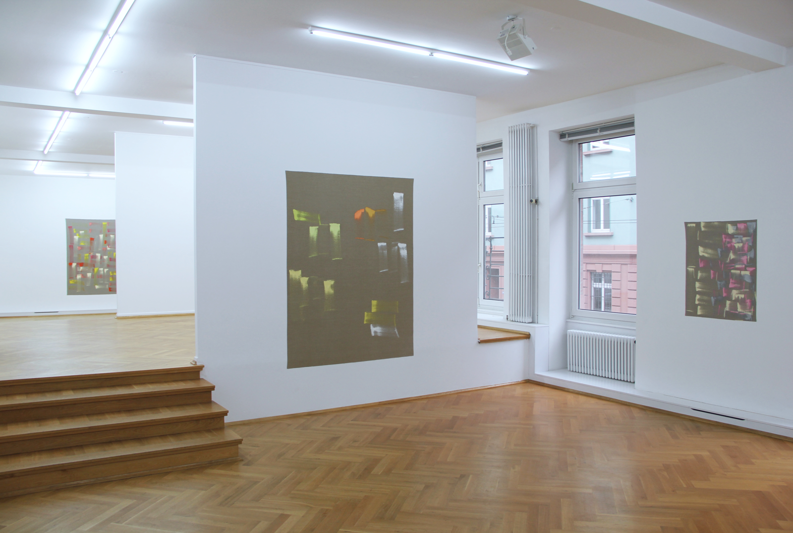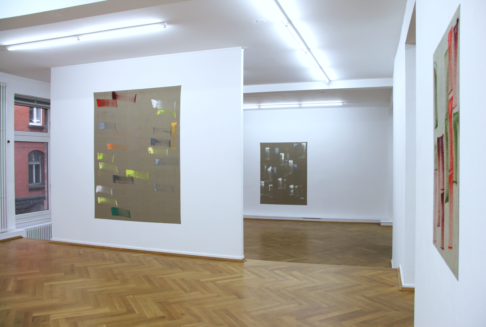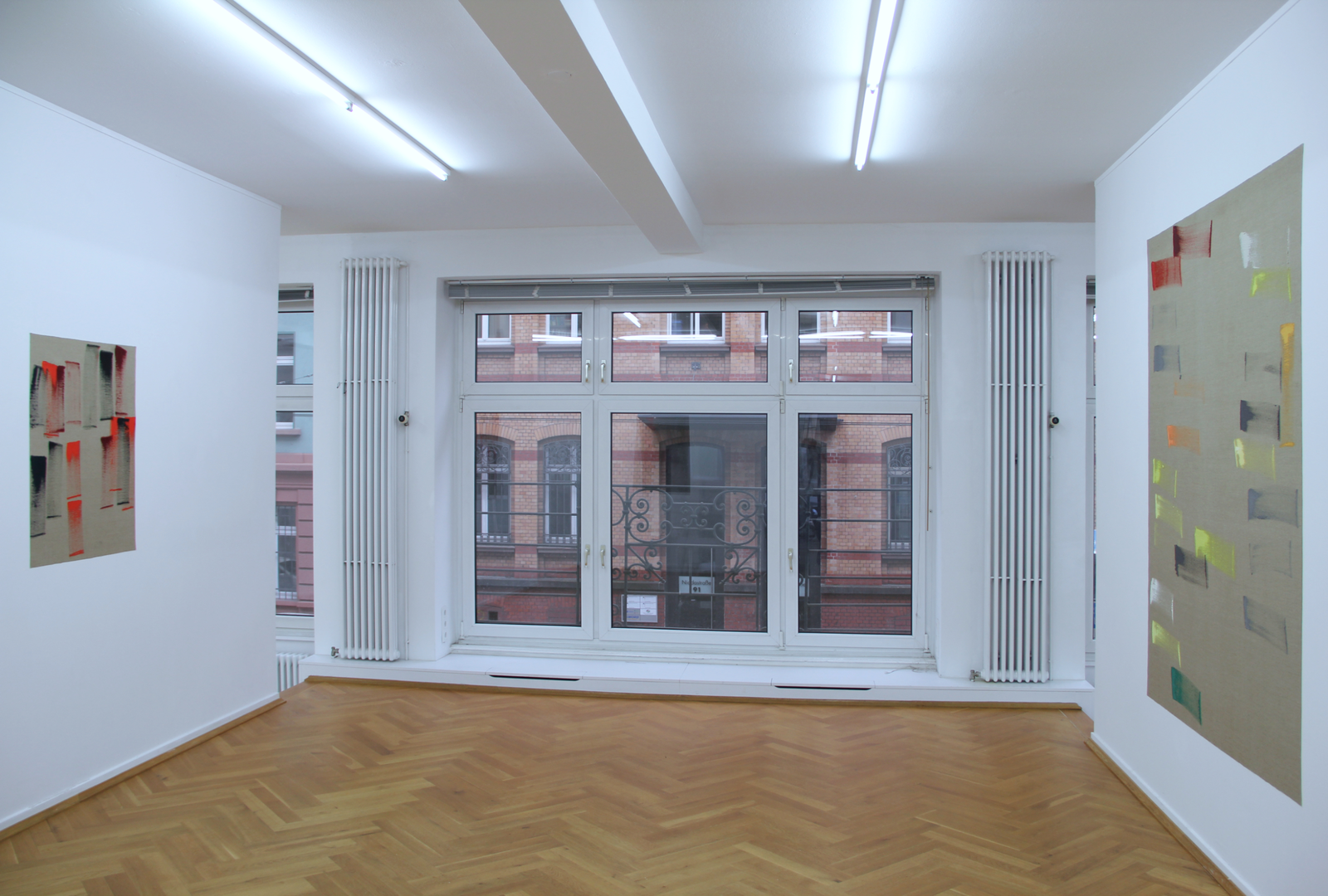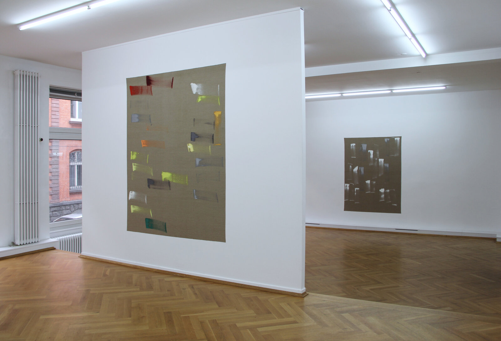 Ingo Meller setzt sich mit den Grundelementen der Malerei auseinander: Leinwand, Farbe, Farbauftrag. Leinwände, deren Form sich an dem Verlauf der Webfäden orientiert, werden als Bildfläche direkt auf die Galeriewände geklebt und so zum Wand-Bild. Die Farbigkeit roher Leinwand und das Fehlen eines Trägers für den traditionellen Bildgrund betonen die Flächigkeit des Bildes und lassen die Malerei besonders plastisch und stofflich erscheinen. Die verwendeten Ölfarben sind gebrauchsfertige Produkte diverser Hersteller, welche für das jeweilige Bild ausgewählt, zusammengestellt und unvermischt zum Einsatz kommen. Meist werden drei oder vier Töne kombiniert, deren Zusammenstellung vor der eigentlichen Arbeit am Bild festgelegt wird. Dabei steht jede aufgetragene Farbe in mehrfacher Relation: zur Farbigkeit der Leinwand, zu den Mitfarben und zu dem sich aus Leinwand und Pinselstrichen ergebenden räumlichen Geflecht. Senkrechte oder waagerechte rasch ausgeführte Pinselstriche setzen die Farbe auf die Leinwand. Die Farbsetzung ist dadurch unwiederholbares Resultat des jeweiligen Augenblicks, das nicht verbessert oder entfernt werden kann. Gestik, Kalkül und Erfahrung sind dabei im Einzelnen unidentifizierbar. Ingo Meller mutet uns zu, zwei Dinge in der Betrachtung seiner Werke auszuhalten: Das Unfertige und gleichzeitig das Vollkommene. Unfertig wirken die Arbeiten, weil es keine abschließende Farbschicht gibt, man sieht den rohen Malgrund und den groben Farbauftrag. Vollkommen sind sie, weil sie in den Augen des Betrachters als Ganzheit, als Bild empfunden werden. Sichtbar entsteht ein Bild, unvollkommen und vollkommen zugleich. Er kann darin schwelgen; aber es ist doch nichts als Leinwand, Farbe, und Farbauftrag, auf die der Betrachter darbend immer wieder zurückgeworfen wird.