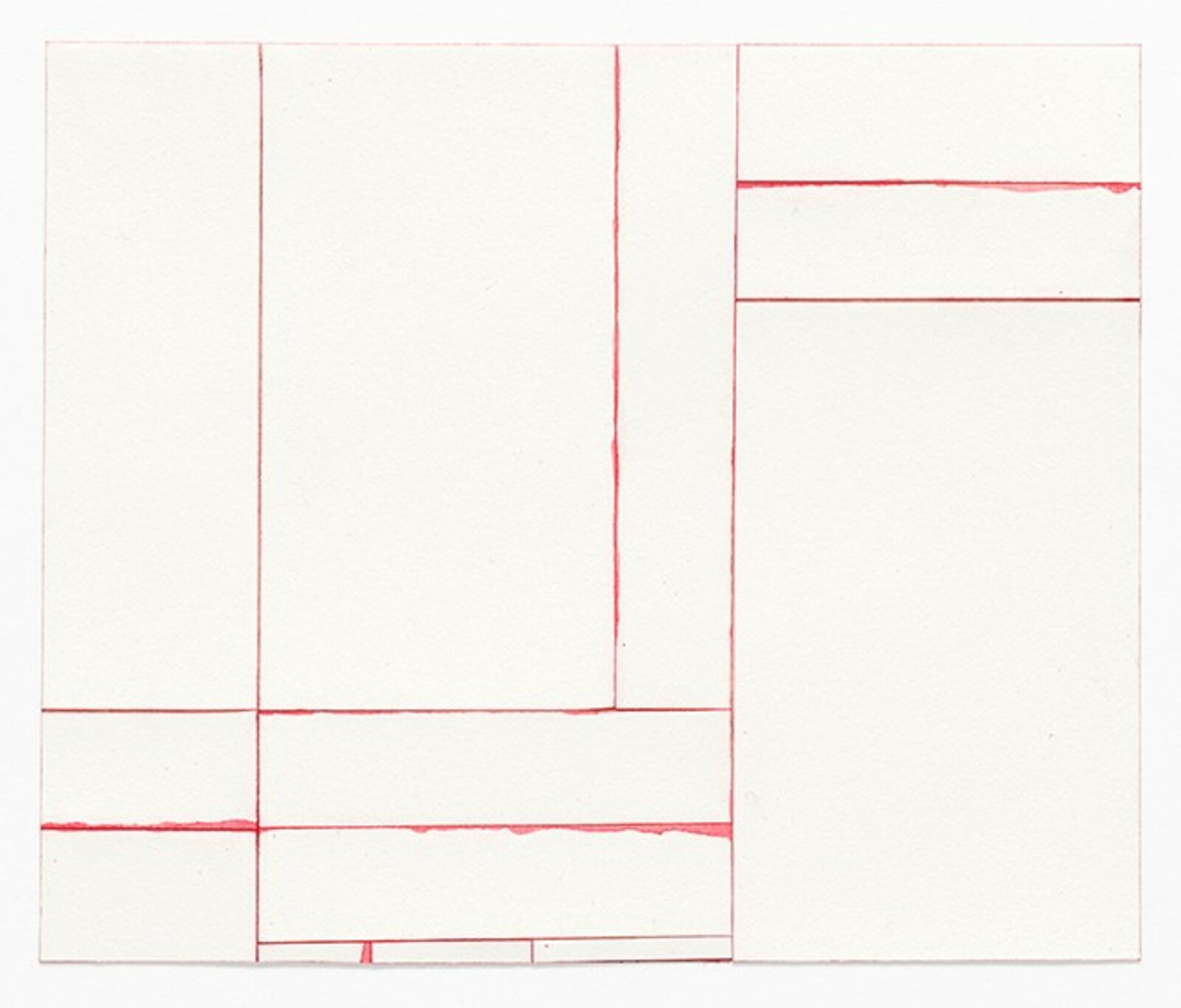 Die entstandenen Schnittkanten werden wieder rot gefärbt, bevor ich sie zueinander verschiebe und zu einem neuen Format zusammensetze. Bei diesen Arbeiten, „Säumnissen", folgt das Schneiden nicht dem Zeichnen, sondern das Zeichnen dem Schneiden, im farbigen Nachziehen der Kanten. Die Außenkanten können sich zu Innenlinien zusammenfügen, die Schnittränder von innen zu Außenkanten werden.“