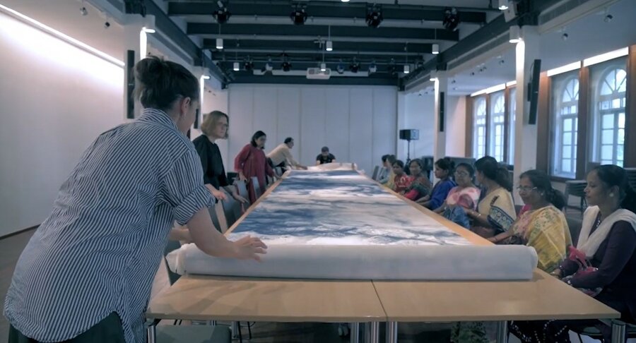 Katja Davar, eine deutsch-britische Künstlerin, wurde vom Goethe-Institut / Max Mueller Bhavan Kolkata eingeladen, ein ortsspezifisches Kunstwerk im Treppenhaus und Eingangsbereich zu schaffen. Davar interessiert sich für neue und alte Technologien und deren Auswirkungen auf Natur und Gesellschaft. In ihrer Arbeit für Kolkata erforscht sie das Thema der technologischen Beschleunigung und deren Auswirkungen auf unseren Planeten, unsere Gesellschaften und unser individuelles Selbst. "On Cables and Cumulus", bestehend aus einer großformatigen Zeichnung und einer Textilarbeit, erstreckt sich über drei Etagen und visualisiert Aspekte von Technologien, die miteinander verwoben sind.