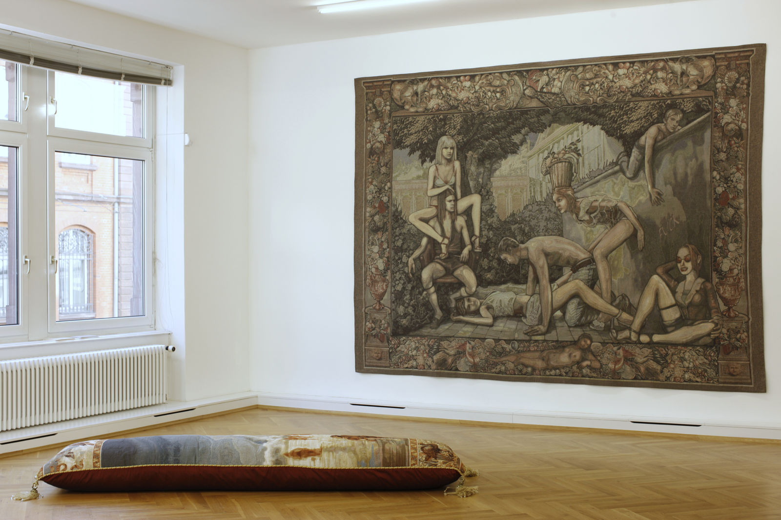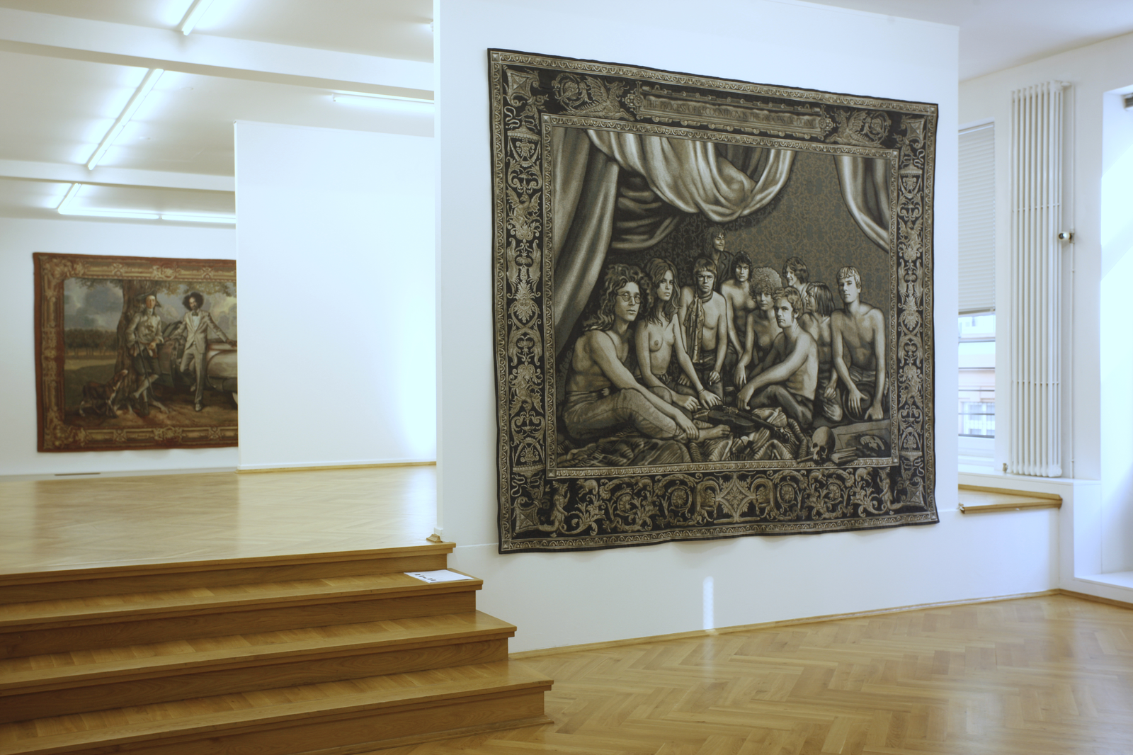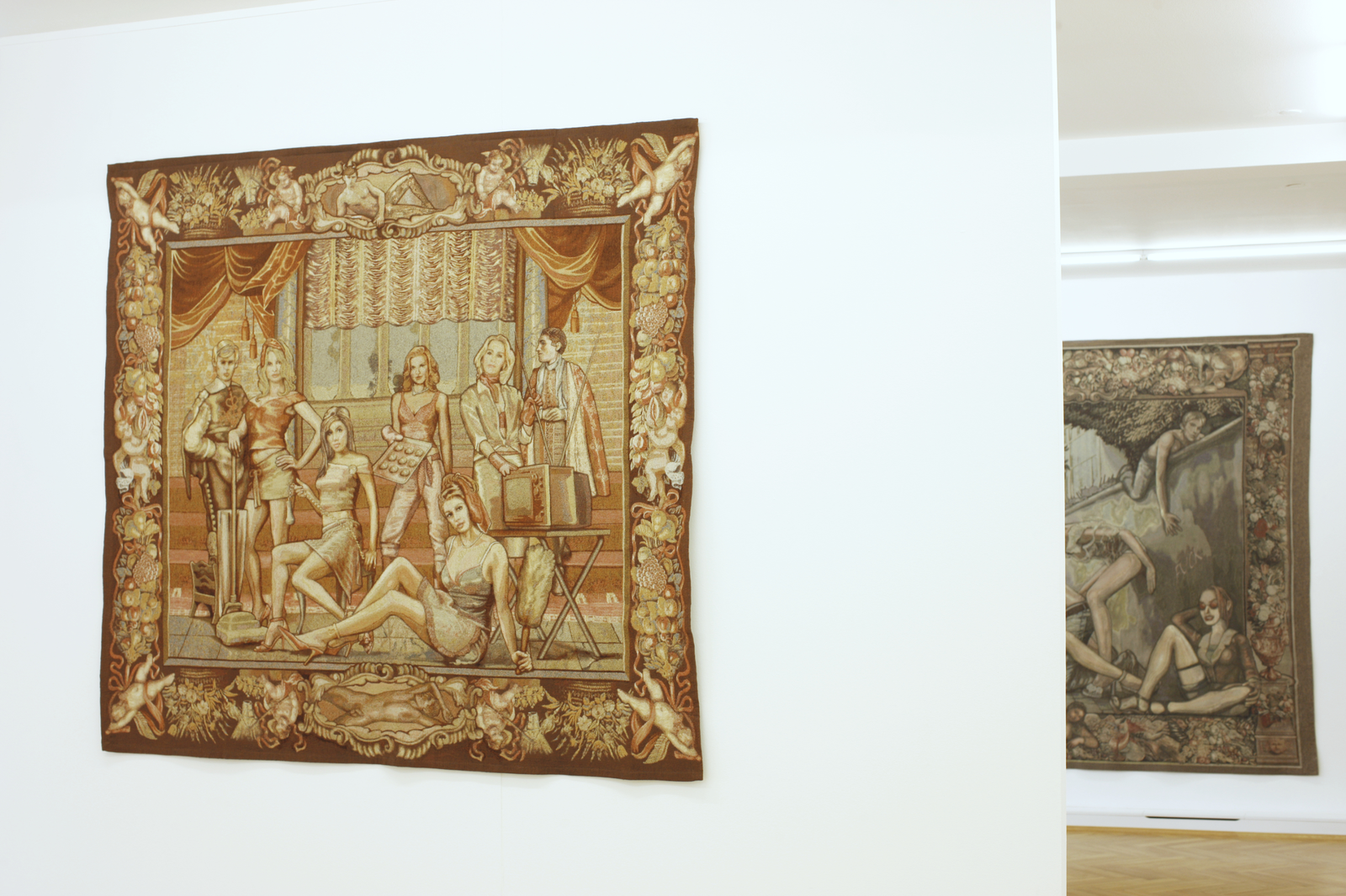 Die Künstlerin Margret Eicher, die vor allem für ihre großformatigen Tapisserien bekannt ist, beschäftigt sich mit dem Spannungsfeld zwischen künstlerischer Form und gesellschaftlichen Inhalten und thematisiert in Ihren Arbeiten die Erwartung an traditionelle Bildträger. Für die Tapisserien, die den Betrachter durch ihre hohe sinnliche Präsenz beeindrucken, wählt sie die zentralen Motive aus den unterschiedlichsten Themenbereichen: aktuelle Medien, Pressefotos, Werbung, Lifestylemagazine und dem Bilderkanon der Kunstgeschichte. Die Bildvorlagen werden in aufwendiger Bearbeitung zu großformatigen Medien – Montagen vereint und nach den digitalen Vorlagen in flandrischen Werkstätten gewebt. Durch die Kombination historischer und zeitgenössischer Bezüge, schaffen es die Arbeiten Margret Eichers die Wahrnehmungsgewohnheiten und Zuordnungen ihres Betrachters zu irritieren. Die Konnotation vertrauter Medien suggeriert zunächst Authentizität und verführt, die Anwesenheit eines traditionell arbeitenden Künstlers anzunehmen. Bei genauerer Betrachtung eröffnet sich jedoch ihr konstruierter Charakter, es werden Motive vorgeführt, die unsere Informationsgesellschaft sowie den Umgang mit Bildmedien generell hinterfragen.