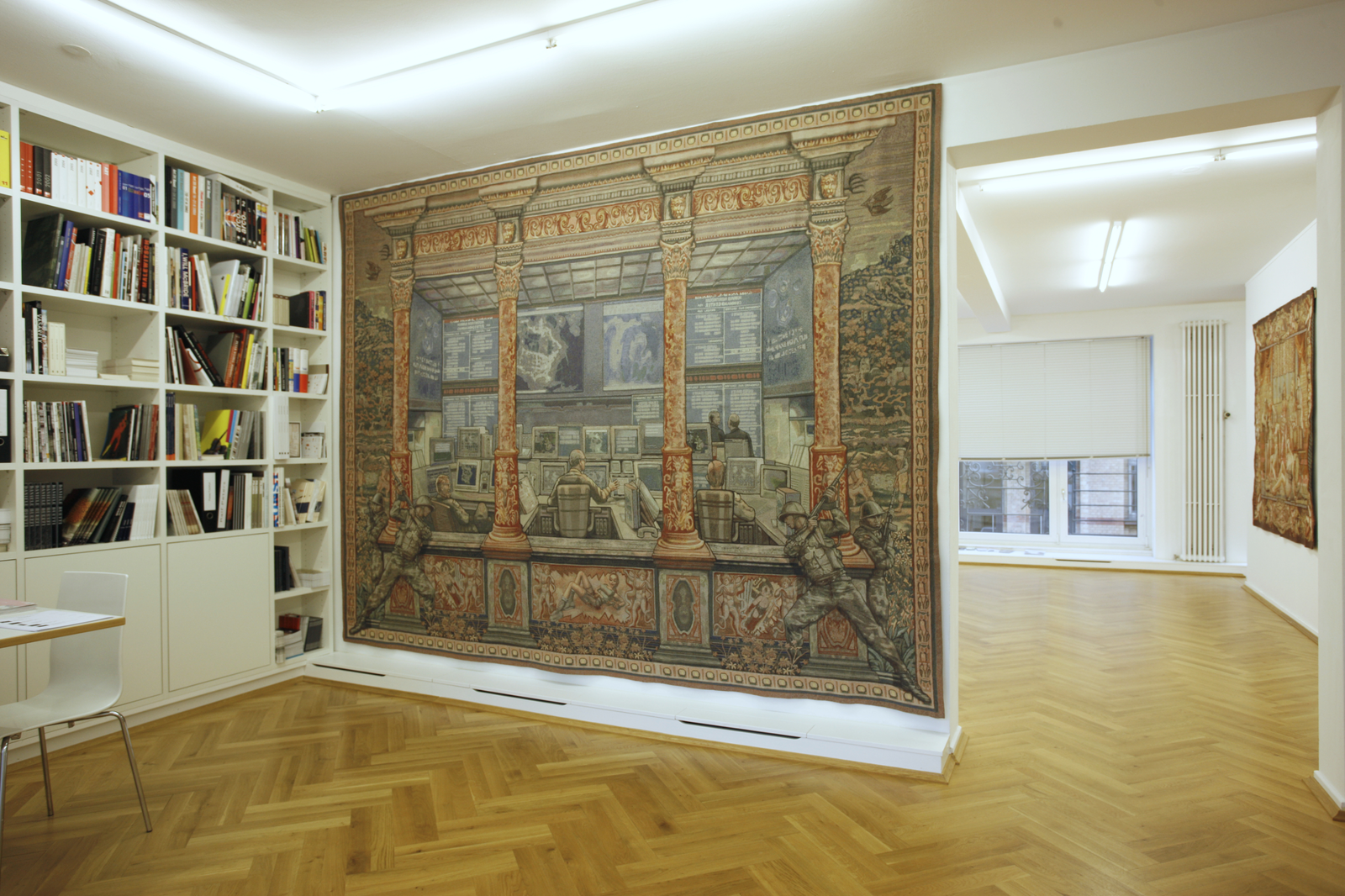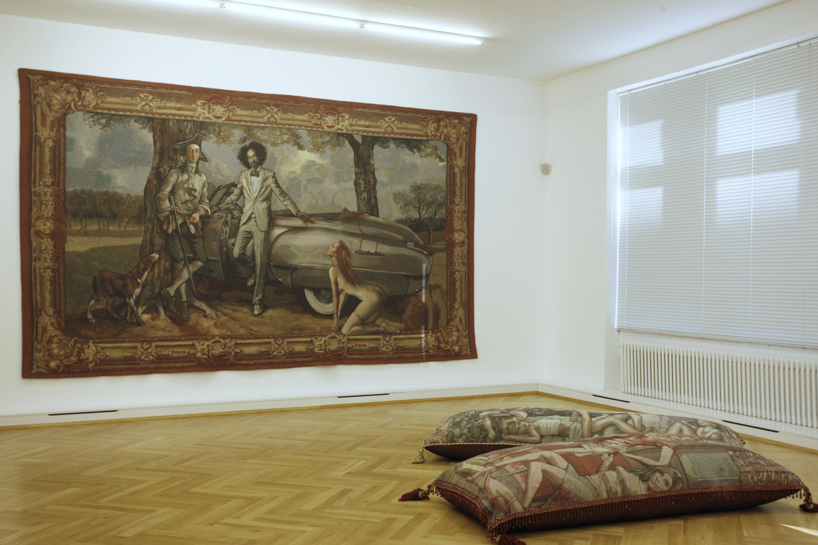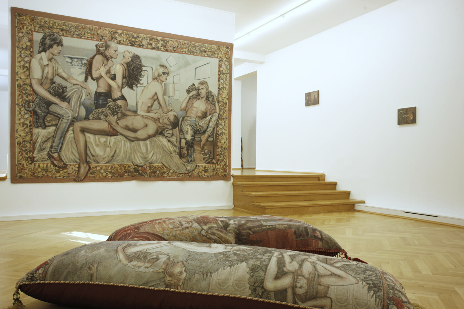 Die Künstlerin Margret Eicher, die vor allem für ihre großformatigen Tapisserien bekannt ist, beschäftigt sich mit dem Spannungsfeld zwischen künstlerischer Form und gesellschaftlichen Inhalten und thematisiert in Ihren Arbeiten die Erwartung an traditionelle Bildträger. Für die Tapisserien, die den Betrachter durch ihre hohe sinnliche Präsenz beeindrucken, wählt sie die zentralen Motive aus den unterschiedlichsten Themenbereichen: aktuelle Medien, Pressefotos, Werbung, Lifestylemagazine und dem Bilderkanon der Kunstgeschichte. Die Bildvorlagen werden in aufwendiger Bearbeitung zu großformatigen Medien – Montagen vereint und nach den digitalen Vorlagen in flandrischen Werkstätten gewebt. Durch die Kombination historischer und zeitgenössischer Bezüge, schaffen es die Arbeiten Margret Eichers die Wahrnehmungsgewohnheiten und Zuordnungen ihres Betrachters zu irritieren. Die Konnotation vertrauter Medien suggeriert zunächst Authentizität und verführt, die Anwesenheit eines traditionell arbeitenden Künstlers anzunehmen. Bei genauerer Betrachtung eröffnet sich jedoch ihr konstruierter Charakter, es werden Motive vorgeführt, die unsere Informationsgesellschaft sowie den Umgang mit Bildmedien generell hinterfragen.