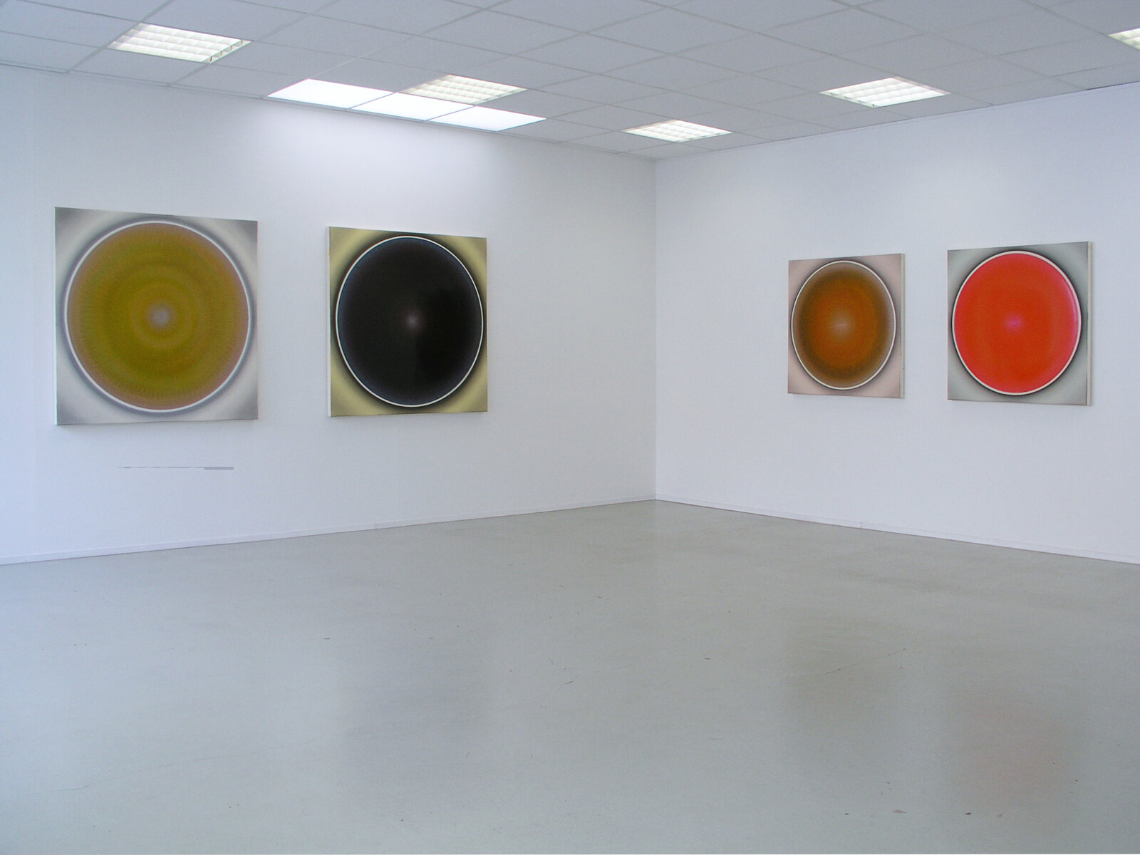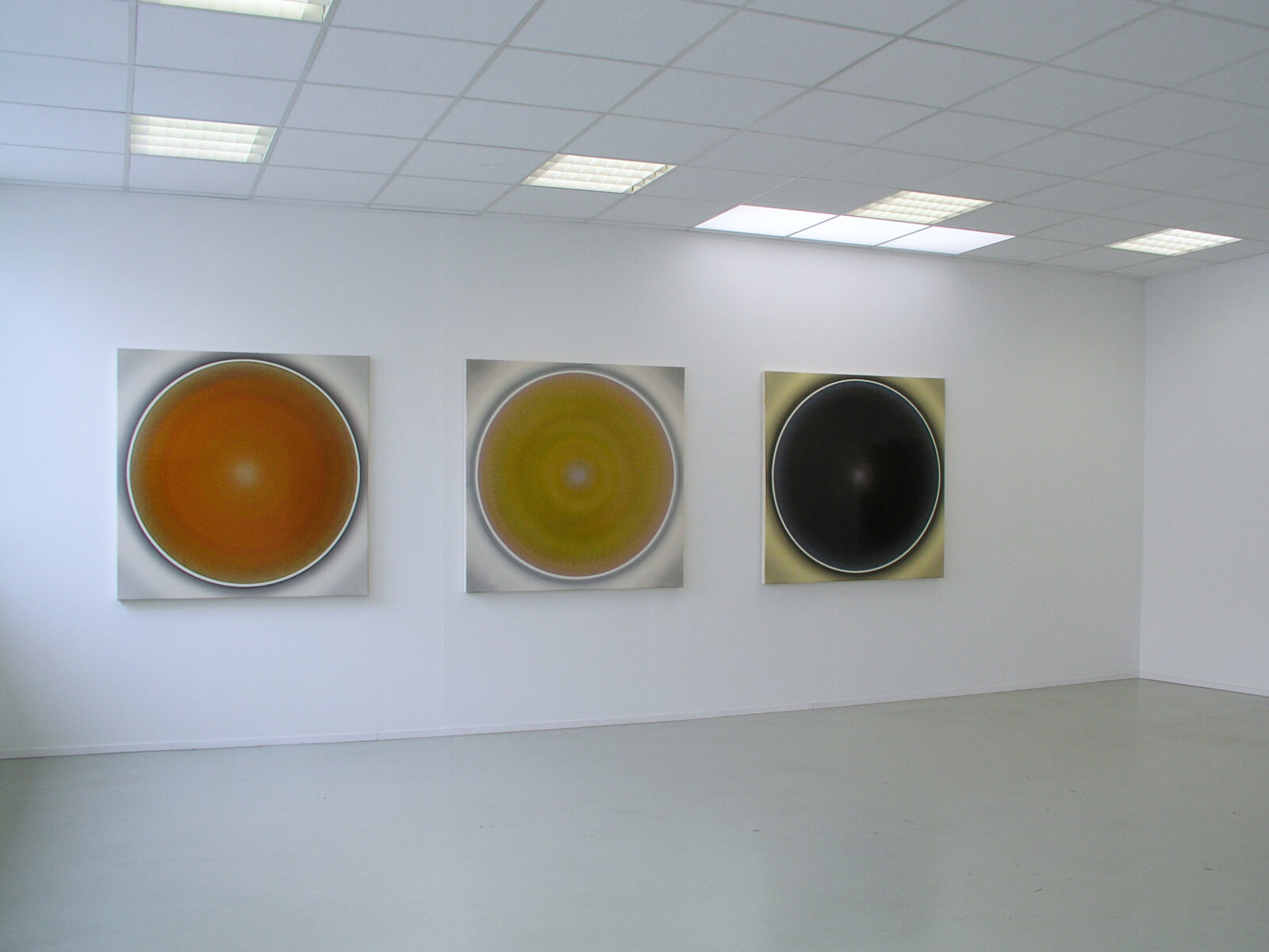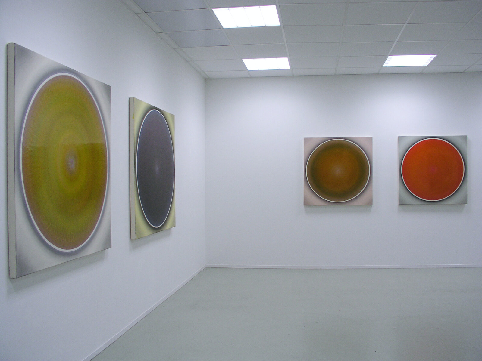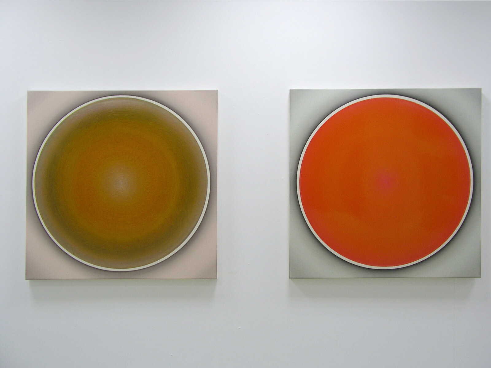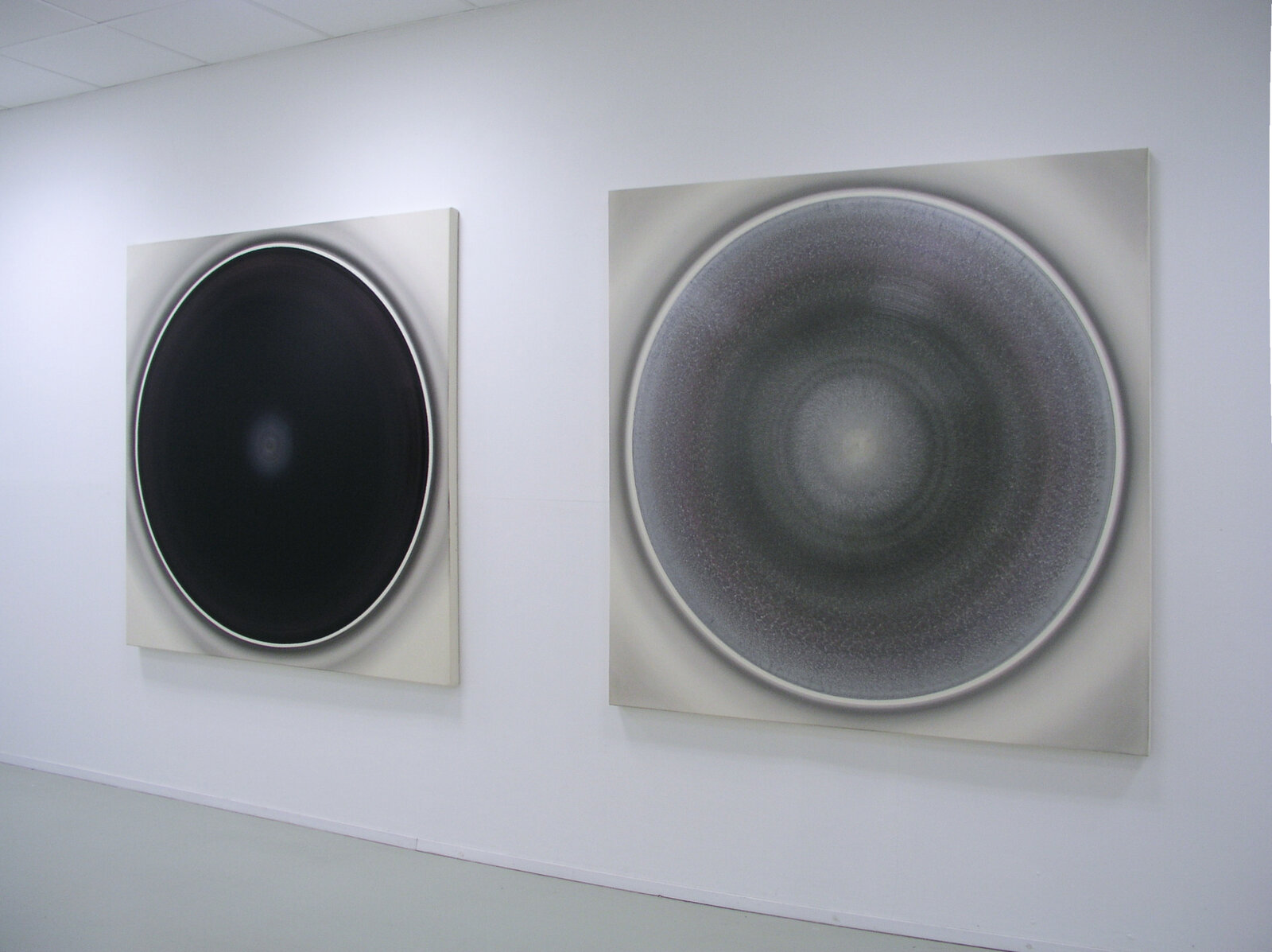 „Der Betrachter wird von der Bildoberfläche in den Bann gezogen, die sich ihm schillernd, lichtbündelnd und glänzend präsentiert. Nähert er sich dieser Bildfläche, ändert sich jedoch dieser Eindruck: Was er zu sehen vermeint hat, ist aus der Nähe betrachtet nicht mehr greifbar, da es sich in Farbmasse, Kratzspuren und Spiegelungen auflöst. Die Lichtbündelungen weisen zum Zentrum des Bildes hin und bewirken dadurch den Eindruck von streng konzentrisch gemalten Kreisen. Doch an diesem Punkt täuscht die Sinneserfahrung den Betrachter: Denn was als Kreis erscheint, ist in Wirklichkeit ein Oval. Der Mittelpunkt der gedachten Kreisform liegt nicht im geometrischen Zentrum, sondern außerhalb - im optischen Zentrum. Die Verwendung von Interferenzpigmenten in Kombination mit zahllosen hauchdünnen transparenten Farbschichten aus Acrylfarbe aufgetragen, erlauben den Bildern sich komplett in ihrer Farbigkeit zu verändern, abhängig davon, ob man sie aus der Richtung des Lichtes oder gegen Richtung des Lichtes betrachtet. Diese Bilder reagieren in ihrer Farbigkeit äußerst sensitiv auf Lichtveränderungen und wirken beinahe wie farbige Spiegel.“ (Robert Schaberl)