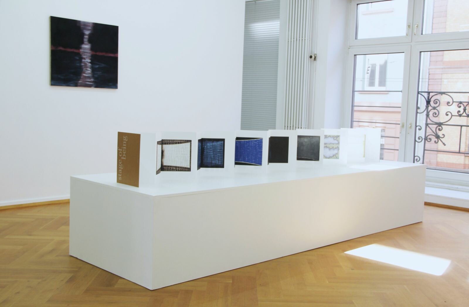 Ein kleines Gemälde aus dem Jahre 2014 fungierte als erster Impuls für die Stage of Being-Gemäldereihe. Trotz seines Formats von nur 30 x 40 cm weist es eine außerordentliche Präsenz auf. Die Komposition zeugt von Schlichtheit und Symmetrie. Ein breiter, leicht gebogener Schirm hebt sich strahlend gelb von dem dunkelvioletten Hintergrund des umgebenden Raumes ab. In der Mitte teilt eine diffuse Form in demselben Violett den Schirm in zwei Teile. Eine Öffnung war meine erste Assoziation, welche aber schon eine Sekunde später der von Konturen einer menschlichen Figur vor einem Bildschirm wich. Abhängig von der Art und Weise, wie meine Augen das Wahrgenommene gerade umsetzten, vermochte die Silhouetten ähnliche Figur ab- oder anwesend zu sein und wandelte sich vom Hintergrund in den Vordergrund, von Raum in Materie.
