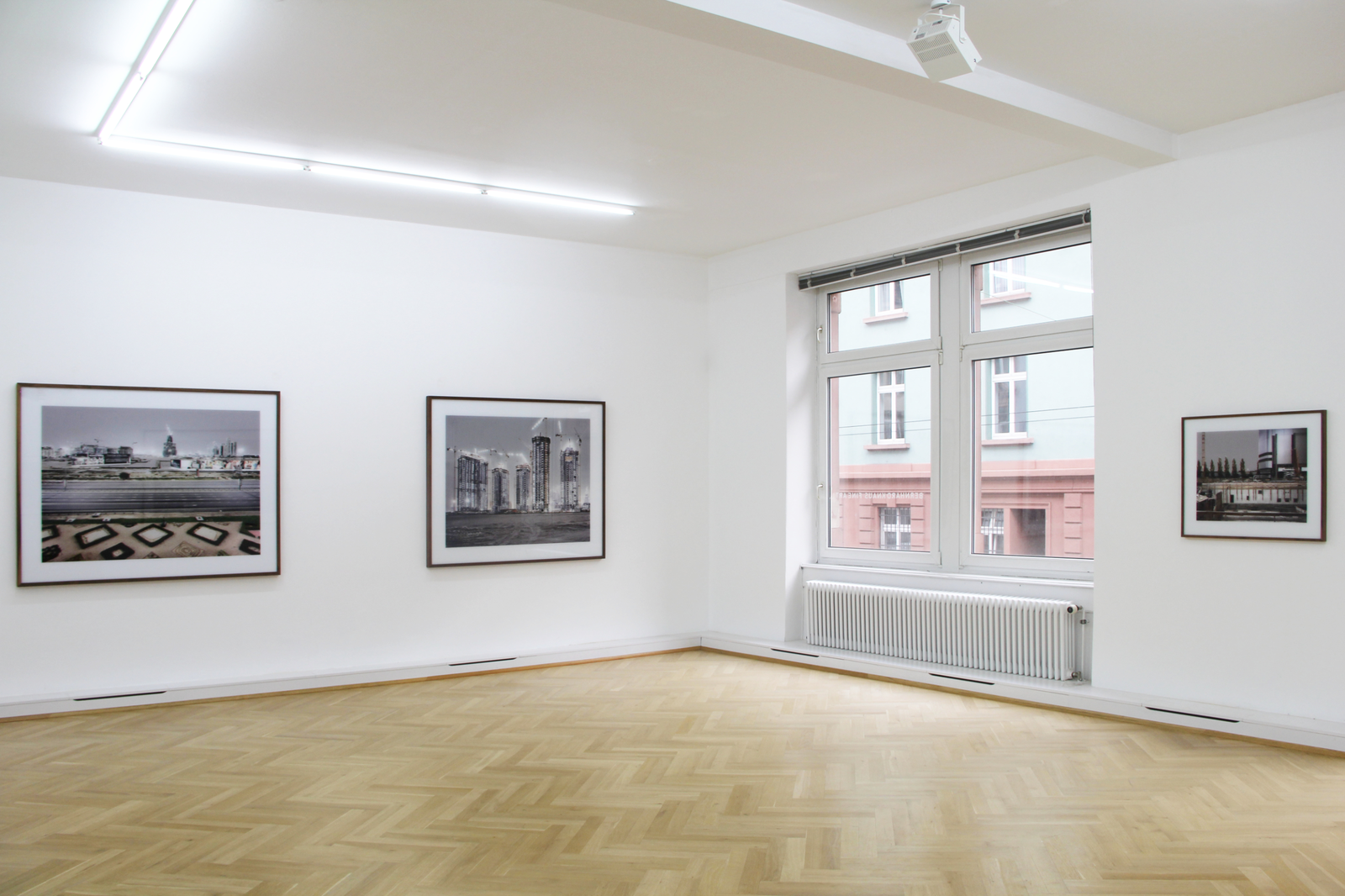 Thomas Weinbergers großformatige Arbeiten erinnern an ungewöhnliche Momente, wie sie sich uns vor Gewittern und deren schnell wechselnden Lichtverhältnissen zeigen; oder Momente kurz vor der Dämmerung, wenn die letzten Sonnenstrahlen flach auf Fassaden treffen und unwirkliche, traumhafte Situationen erzeugen. Jedoch stellt der Betrachter schnell fest, dass es sich hier nicht um reale, vom Fotografen so vorgefundene Situationen handeln kann: Diese vor allem durch das Licht evozierte Stimmung, die in den Fotografien Weinbergers vorherrscht, wurde künstlich erzeugt.