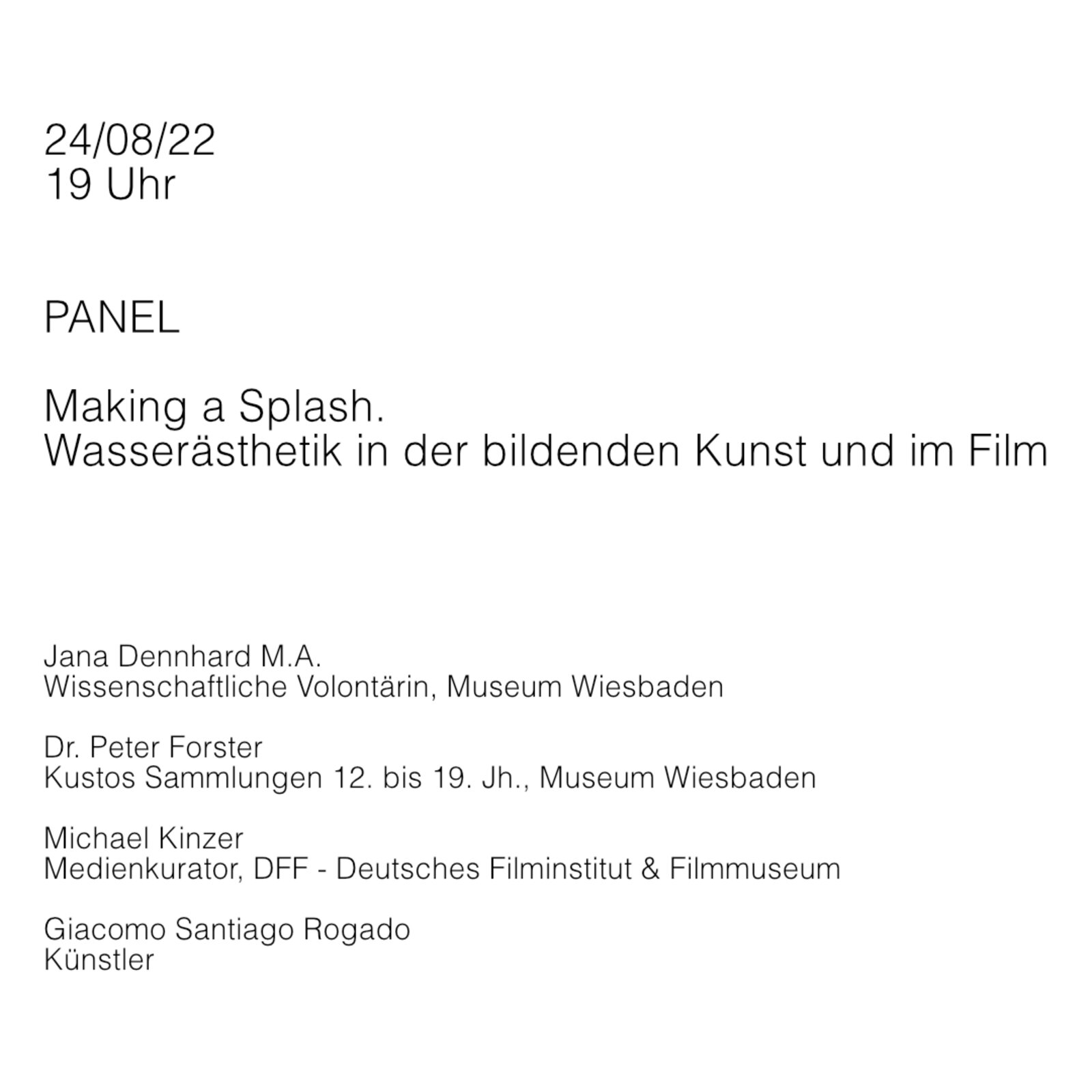 For the panel "Making a Splash" Michael Kinzer (DFF), Dr. Peter Forster and Jana Dennhard (Museum Wiesbaden) as well as the artist Giacomo Santiago Rogado will come together at our gallery to talk about the importance of water for artistic processes, its aesthetic qualities and impact.