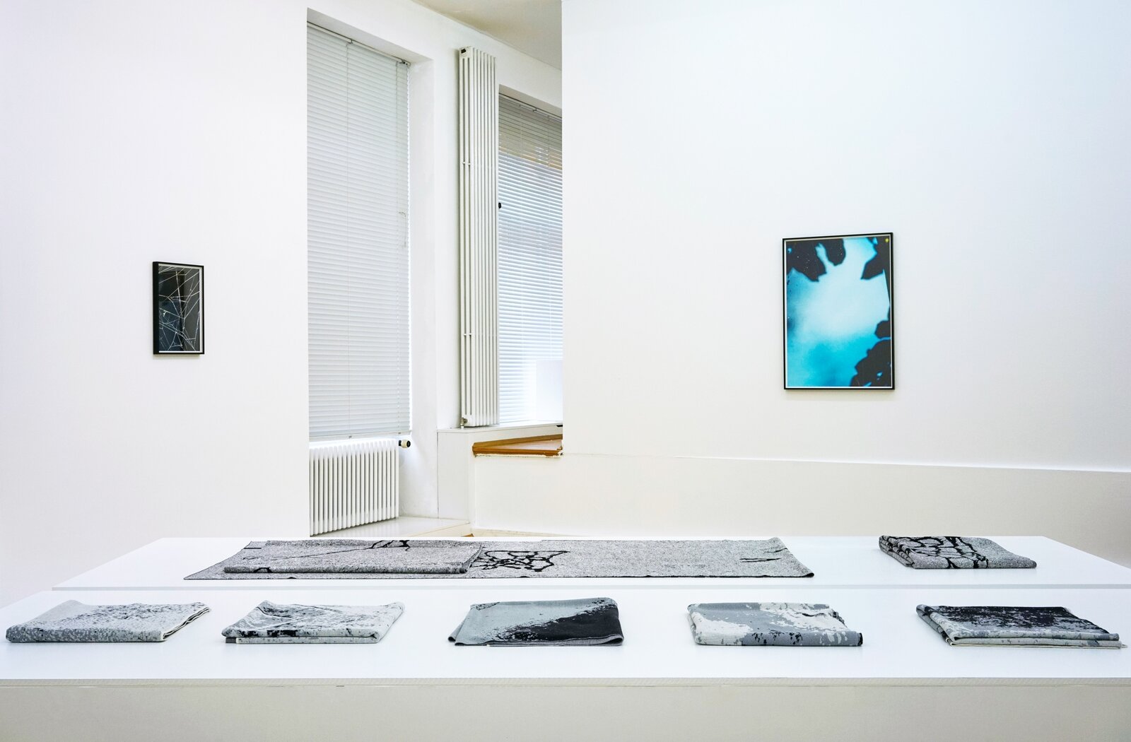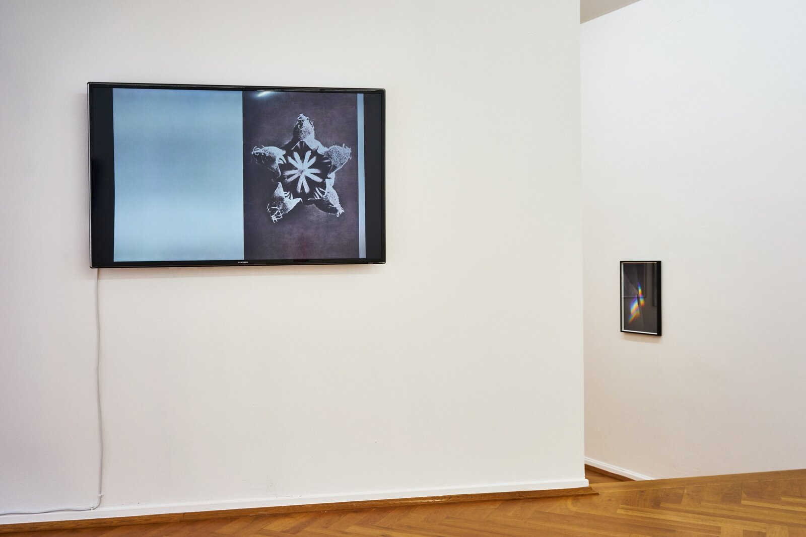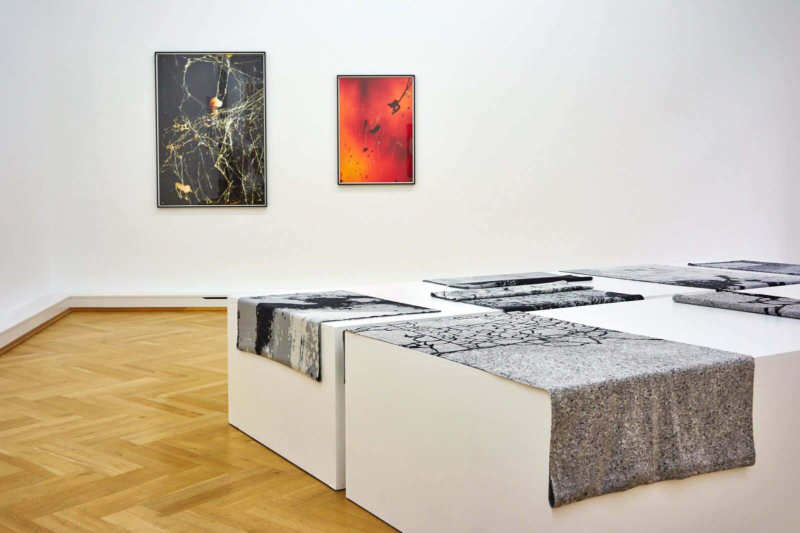 For Ornaments of Property Sascha Pohle arranged hundreds of reject DVD and CD computer drives, the relics of a dying mnemonic and reproduction technology to create fictitious, ruin-liked architectural fragments kindling associations with different ages, cultures and worlds. The objects in Flo Maak’s photo series Gravity likewise bring to mind past ages when the development of technology was pegged directly to human progress. Mainly he has gathered together plumb lines, old measuring tools consisting of a weight on a line, that Maak photographically stages against the background of the modern space revolution as flying objects. Sascha Pohle’s Passage also intervene directly in the space. Knitted wools with abstract patterns that are based on digital shots of different asphalt and concrete floors are translated into soft and mobile terrain that are constantly being re-folded and arranged for the course of the exhibition. In String Stories Flo Maak addresses natural patterns and presents in part destroyed webs of the golden silk spider that is widespread in Korea. Maak photographed them in front of colored backgrounds and using artificial light, thus rendering the fine threads visible. The title forges a link to archaic games in which a thread was spun with the finders of at least two hands to create figures that often imitated nature. In this context, Sascha Pohle’s video film After the Gift - Blossfeldt’s Fan revisits the interaction of structures between humans and nature. On view are different woven fans waving in slow motion to turn book pages showing Karl Blossfeldt’s photographs of buds, blossoms and seeds, a mimetic game with shapes, colors and the patterns of plants and fans that is constantly being kept in motion by the invisible element of wind. As alluded to in the title, After the Gift - Blossfeldt’s Fan points to a gift having a second lease of life and to the related relationships that like those in String Stories depend on cohabitation and transformation.